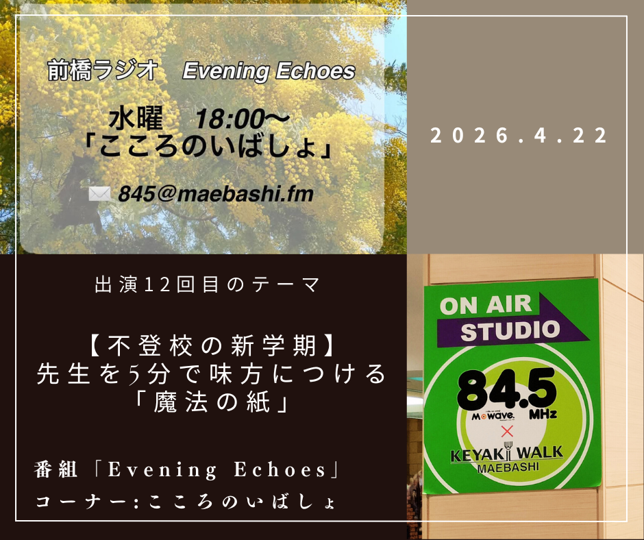 この内容は、ラジオ番組『EVENING ECHOES』のコーナー【こころのいばしょ】(まえばしCITYエフエム 84.5MHz)放送日:2026.4.22 にて、石黒やちよが解説した内容をもとに制作しています。
